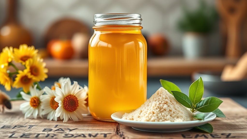 You can find keto-friendly honey substitutes made from ingredients like erythritol, monk fruit, or stevia, which don’t cause honey crystallization issues or affect blood sugar levels. These alternatives mimic honey’s sweetness without relying on natural sugars, often using specialized honey extraction processes that preserve flavor while keeping carbs low. They’re perfect for satisfying your sweet tooth on a keto diet without compromising your goals.