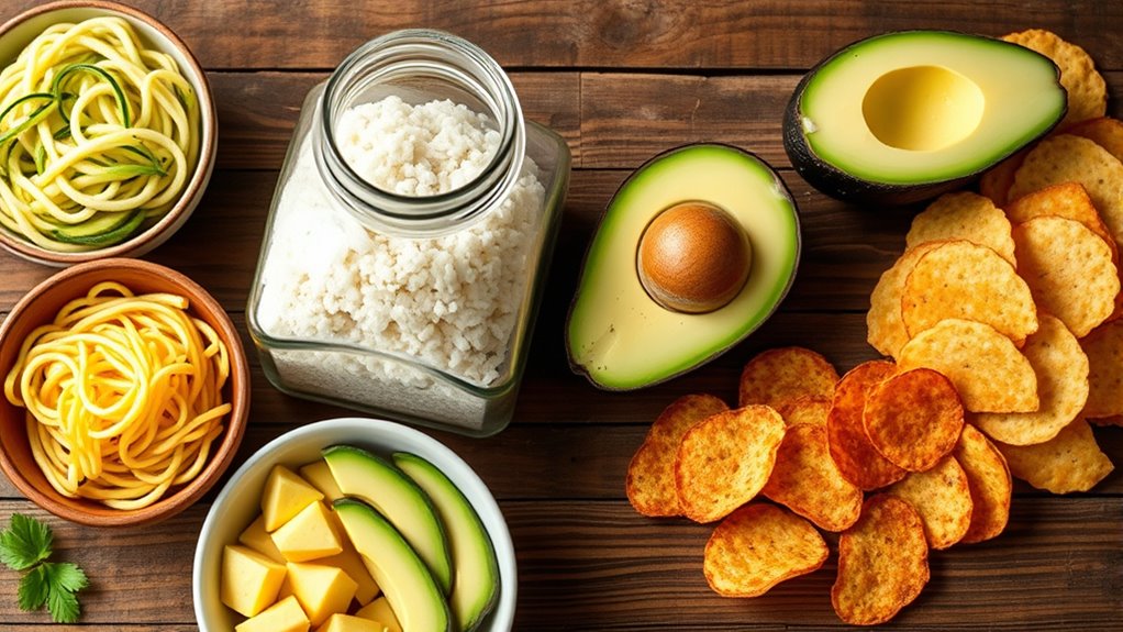 When it comes to pasta, many people miss the comforting, carb-heavy dishes they used to love. Luckily, low carb alternatives for pasta are widely available. Zucchini noodles, also called zoodles, are a popular choice—just spiralize zucchinis to mimic the texture of traditional pasta. Shirataki noodles made from konjac root are another excellent option; they’re very low in carbs and have a neutral flavor that absorbs sauces well. Cauliflower rice or mashed cauliflower can also serve as a base for pasta-like dishes. You can toss these low-carb pasta alternatives with your favorite keto-friendly sauces—think creamy Alfredo, pesto, or marinara made without sugar—to recreate the flavors you crave. These swaps not only cut carbs but also add fiber and nutrients to your meals, making them more satisfying. Additionally, understanding the cost differences of various low-carb ingredients can help you plan your meals more effectively without overspending.