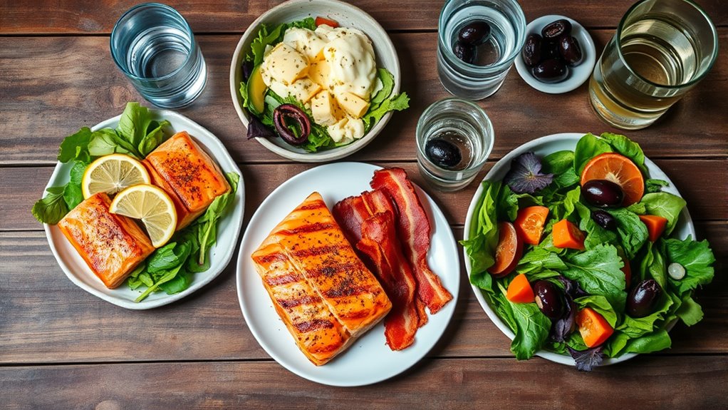 When dining out on keto, you should plan ahead with keto restaurant tips, like checking menus online and calling ahead to ask about low-carb options. Focus on ordering grilled meats, seafood, non-starchy vegetables, and salads with olive oil or butter. Avoid bread, pasta, and sugary drinks. By being mindful and prepared, you can enjoy dining out keto without sacrificing your goals.