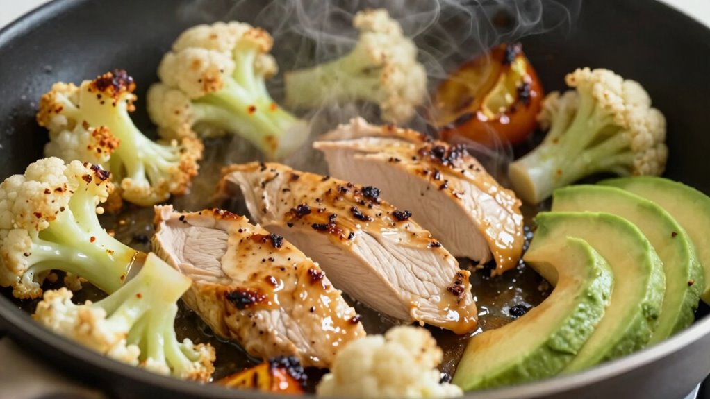 Gentle heat in keto meal prep softens vegetables and dairy without overcooking, helping them retain nutrients and texture. It breaks down connective tissues in meats for tender results and prevents ingredients from becoming mushy or rubbery. Slow cooking, caramelization, and browning develop rich flavors, while steaming and low-temperature methods preserve nutrients and moisture. If you want to master how gentle heat enhances flavor and texture in keto dishes, there’s more to discover below.
