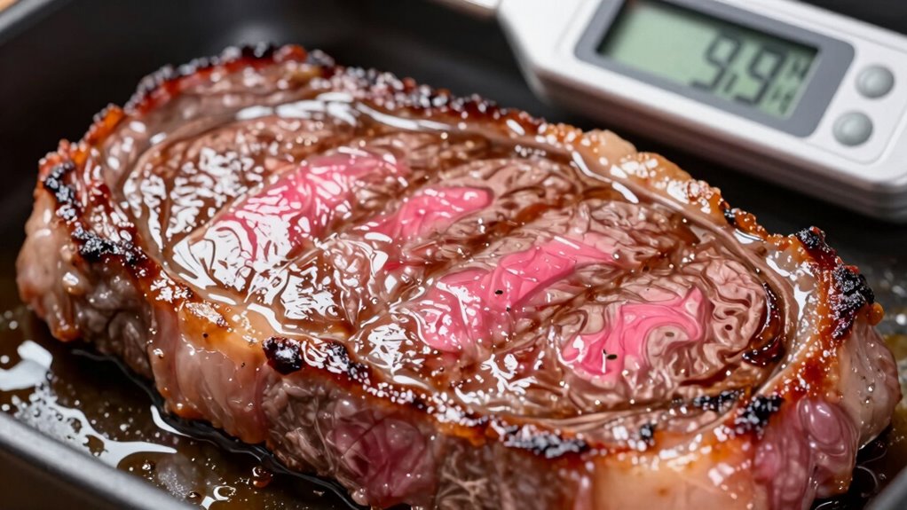 You’ll know your protein is perfectly cooked when it’s tender, juicy, and retains its natural flavor enhancement. A perfectly cooked piece will have a firm yet delicate texture, not mushy or rubbery. Overcooked protein, ironically, loses all its charm—becoming dry, tough, and flavorless. To avoid this, monitor the temperature carefully, ensuring best texture preservation and flavor, so you get that ideal bite every time.